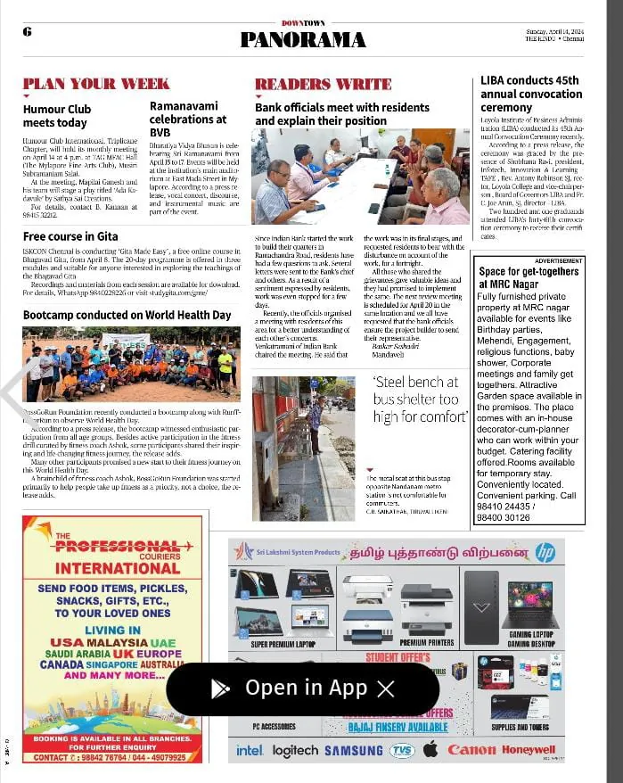 Press release by The Hindu Downtown (Mylapore) – Published in Page 6 – April 14, 2024